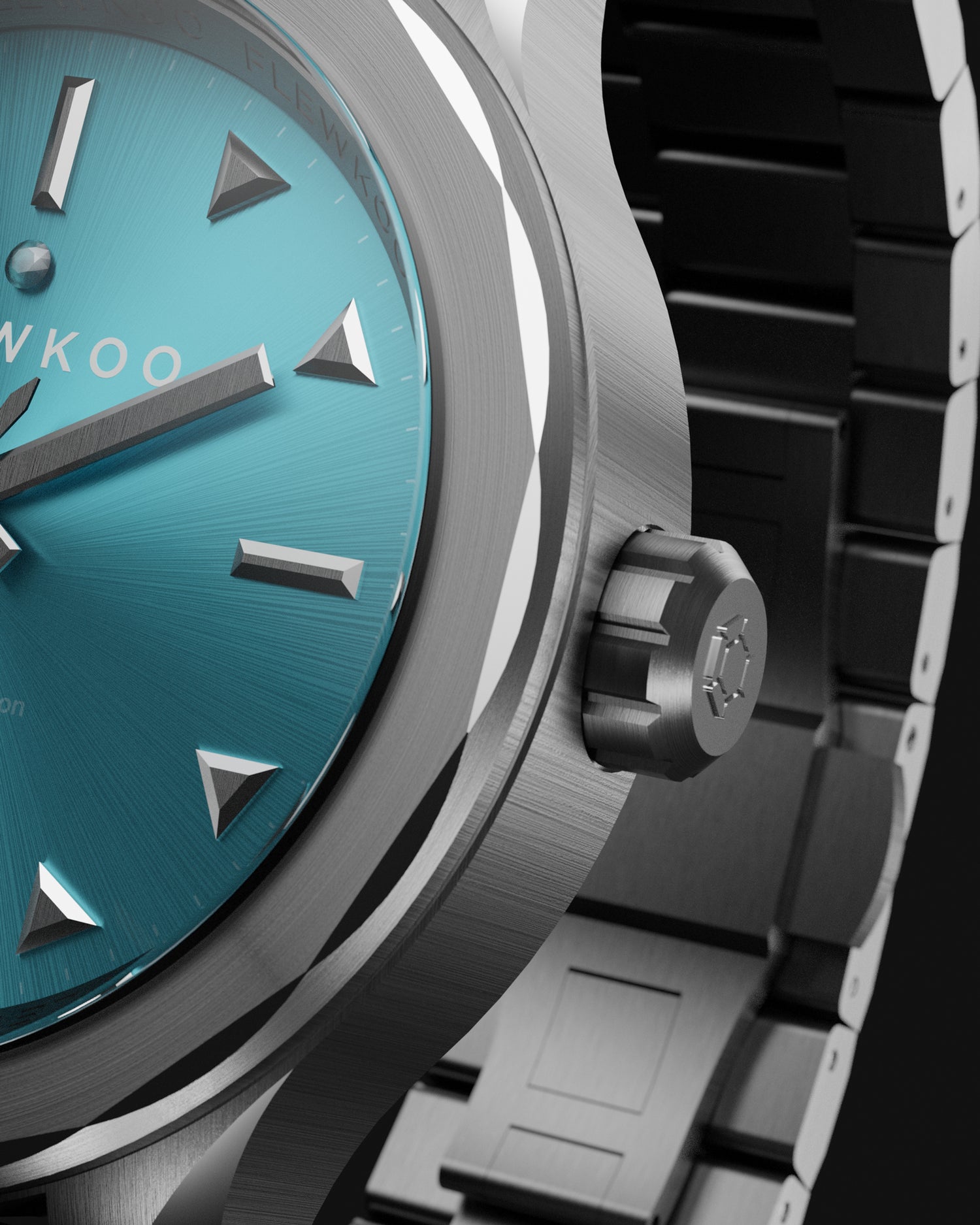 The Glacier captures attention with its striking blue sunray dial and polished bezel facets. This bold design is inspired by the blue glaciers of Mount Olympus. Constructed with double finished stainless steel for a sleek look. The Glacier is a refined timepiece at heart.